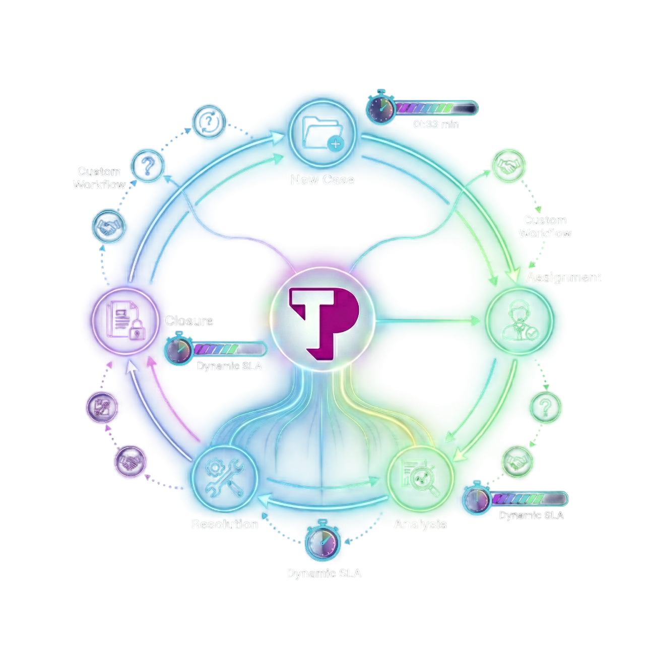 Controle total do ciclo de vida dos atendimentos, com suporte a fluxos (workflows) personalizados e SLAs dinâmicos.